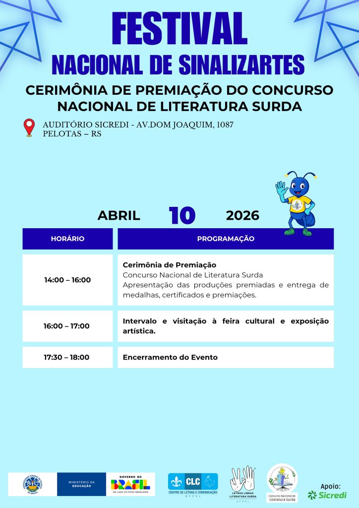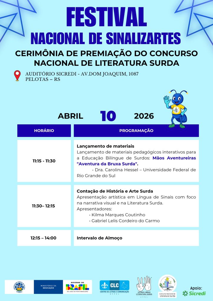 Universidade Federal de Pelotas (UFPel), por meio do Projeto de Extensão Concurso Nacional de Literatura Surda, torna público o presente edital para o 1º Festival Nacional de Sinalartes, que integra a programação presencial do Concurso Nacional de Literatura Surda de 2026. O Festival será realizado no dia 10 de abril de 2026, no Auditório Sicredi, na cidade de Pelotas/RS