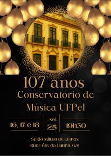 • 18/09 – Celebração dos 107 anos do Conservatório de Música da UFPel com apresentação dos professores dos Cursos de Música da UFPel e dos grupos Iluminura e Camerata UFPel