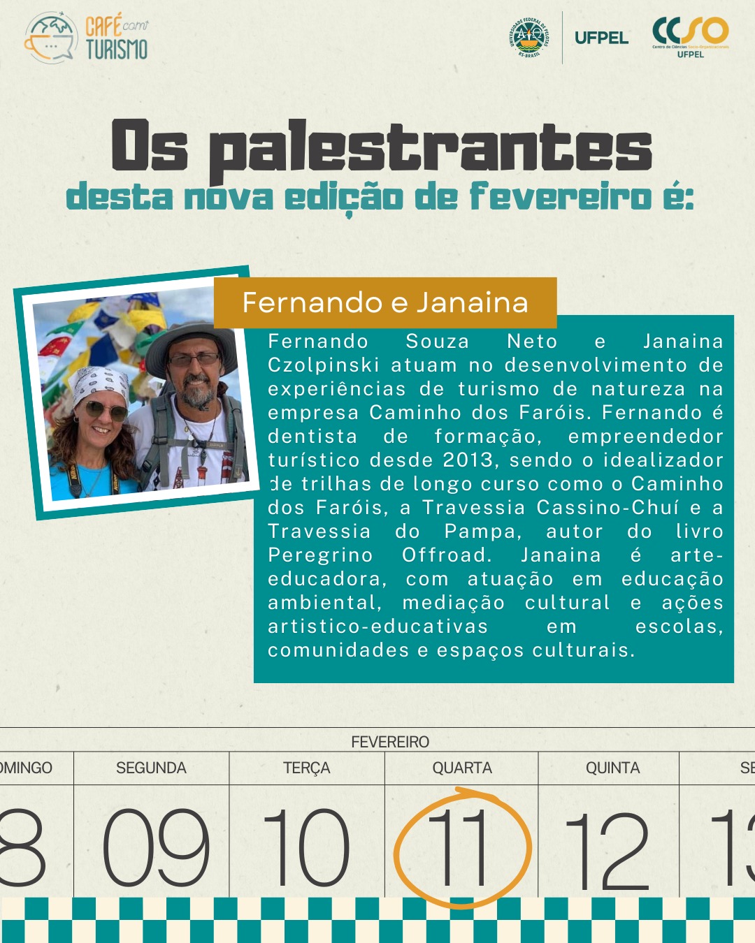 A edição deste mês trará como tema “Turismo regenerativo e caminhadas transformadoras”, com os palestrantes Fernando Souza Neto e Janaina Czolpinski, que atuam no desenvolvimento de experiências de turismo de natureza na empresa Caminho dos Faróis. Fernando é dentista de formação, empreendedor turístico desde 2013, sendo o idealizador de trilhas de longo curso como o Caminho dos Faróis, a Travessia Cassino-Chuí e a Travessia do Pampa, autor do livro Peregrino Offroad. Janaina é arte-educadora, com atuação em educação ambiental, mediação cultural e ações artistico-educativas em escolas, comunidades e espaços culturais. O evento acontecerá no dia 11/02, às 17h de forma presencial no auditório Acadêmico no campus Anglo.