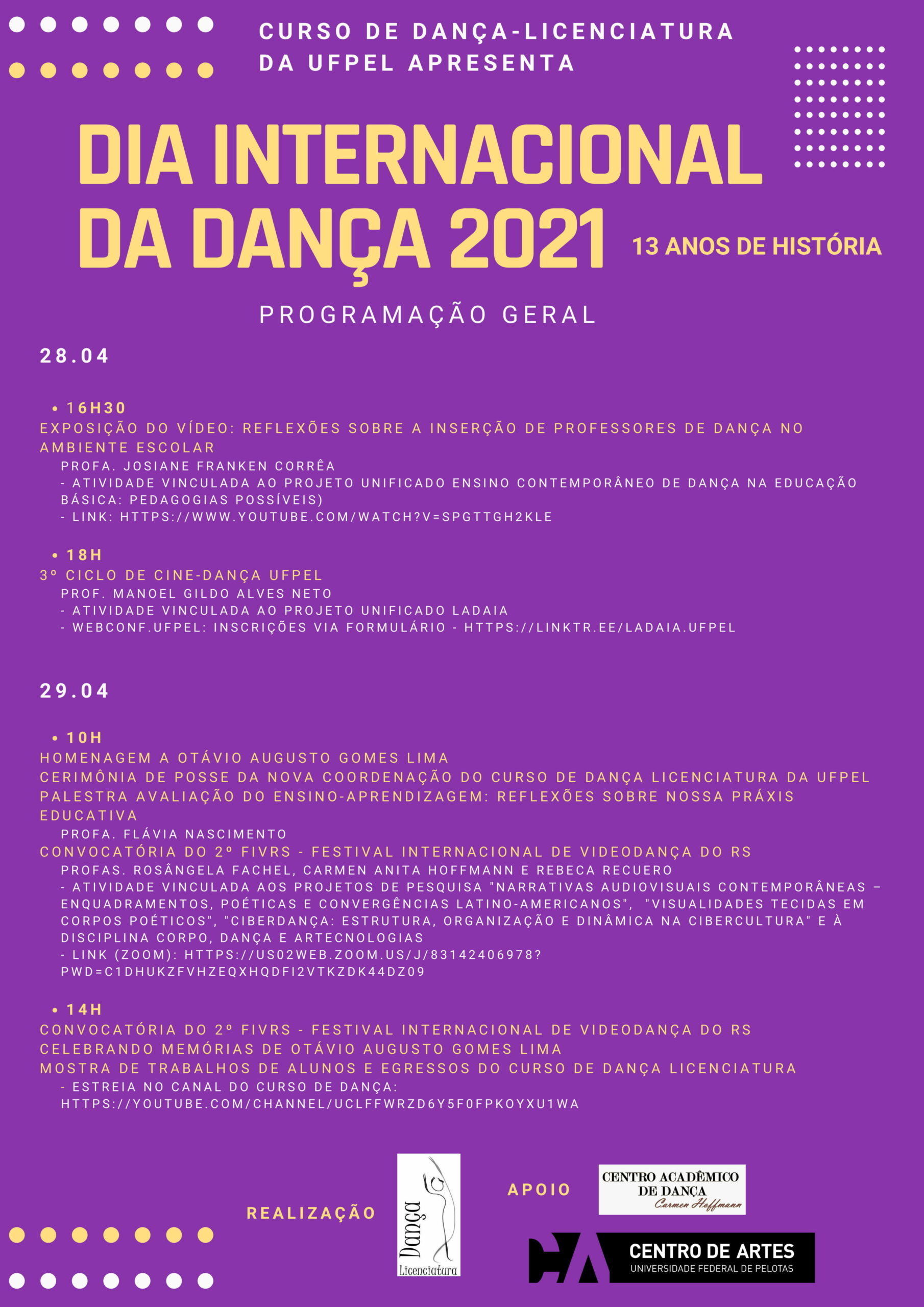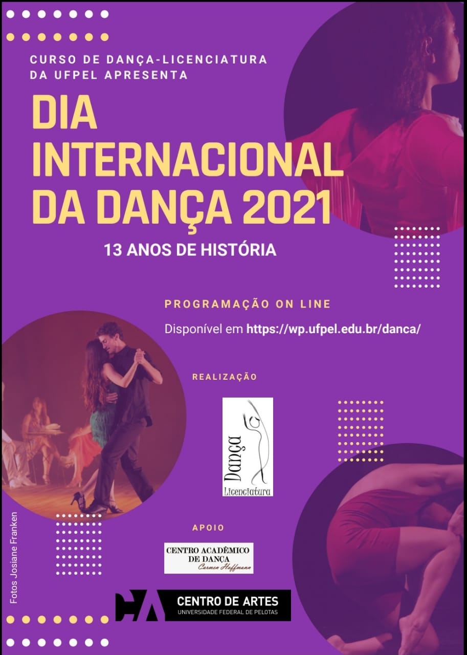 Com o propósito de comemorar o Dia Internacional da Dança e o aniversário de 13 anos de nosso curso, organizamos um evento com ações diversas que irão nos conectar numa mesma vibração para, juntos virtualmente, festejarmos esse momento, buscando mostrar a toda a comunidade a importância da Dança para o mundo ao qual vivemos.