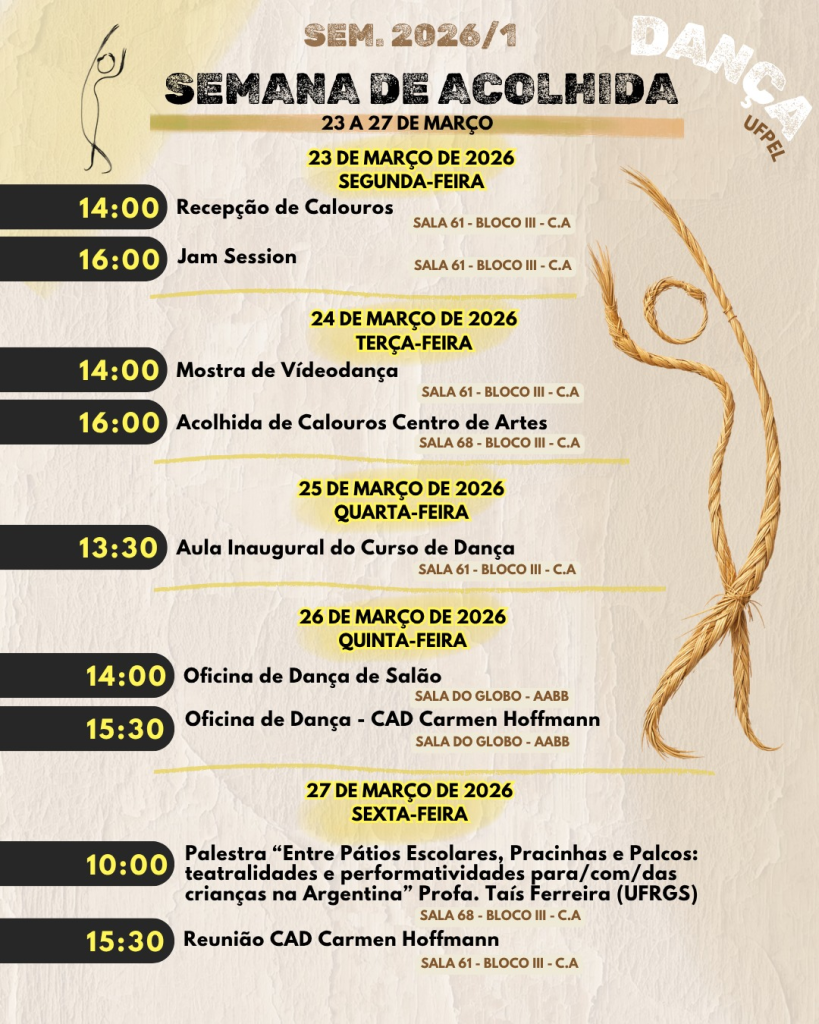 Está chegando a nossa Semana de Acolhida do curso de Dança da UFPel!