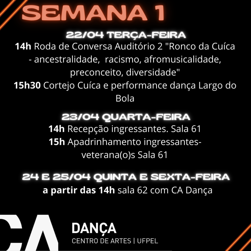 ✨ Parabéns aos acadêmicos e orientadores do Curso de Dança – Licenciatura da UFPel, que se destacaram na 11º SIIEPE (Semana Integrada UFPel 2025)! Celebramos a dedicação, a sensibilidade e o compromisso com a pesquisa, a extensão e o ensino da dança, refletidos em trabalhos que unem arte, educação e diversidade. ✨ XI CONGRESSO DE ENSINO DE GRADUAÇÃO Acadêmico: Anderson Roberto Cruz da Silveira Orientadora: Profa. Dra. Alexandra Dias Trabalho: Conceitos e Culturas abordadas no TCC de uma Drag Queen Negra do Curso de Licenciatura […]