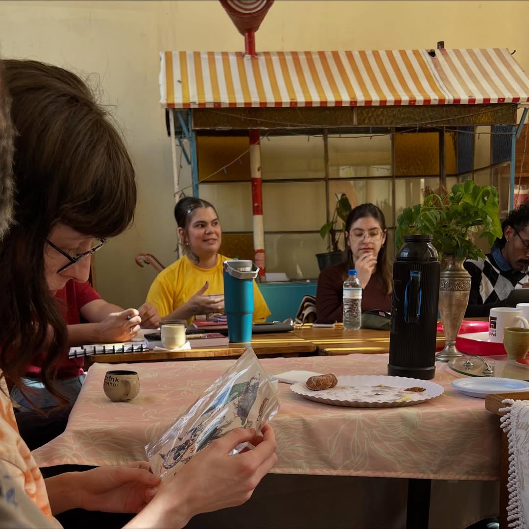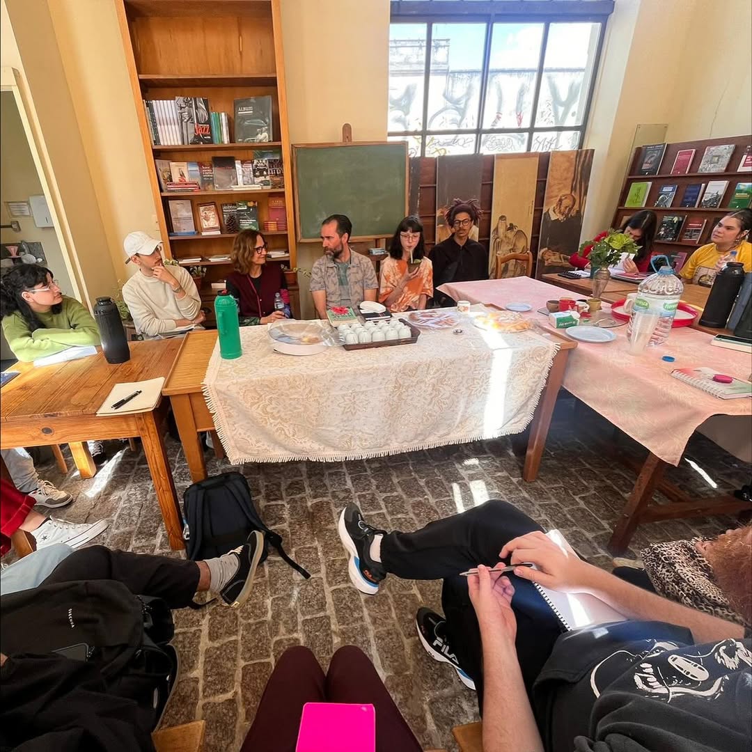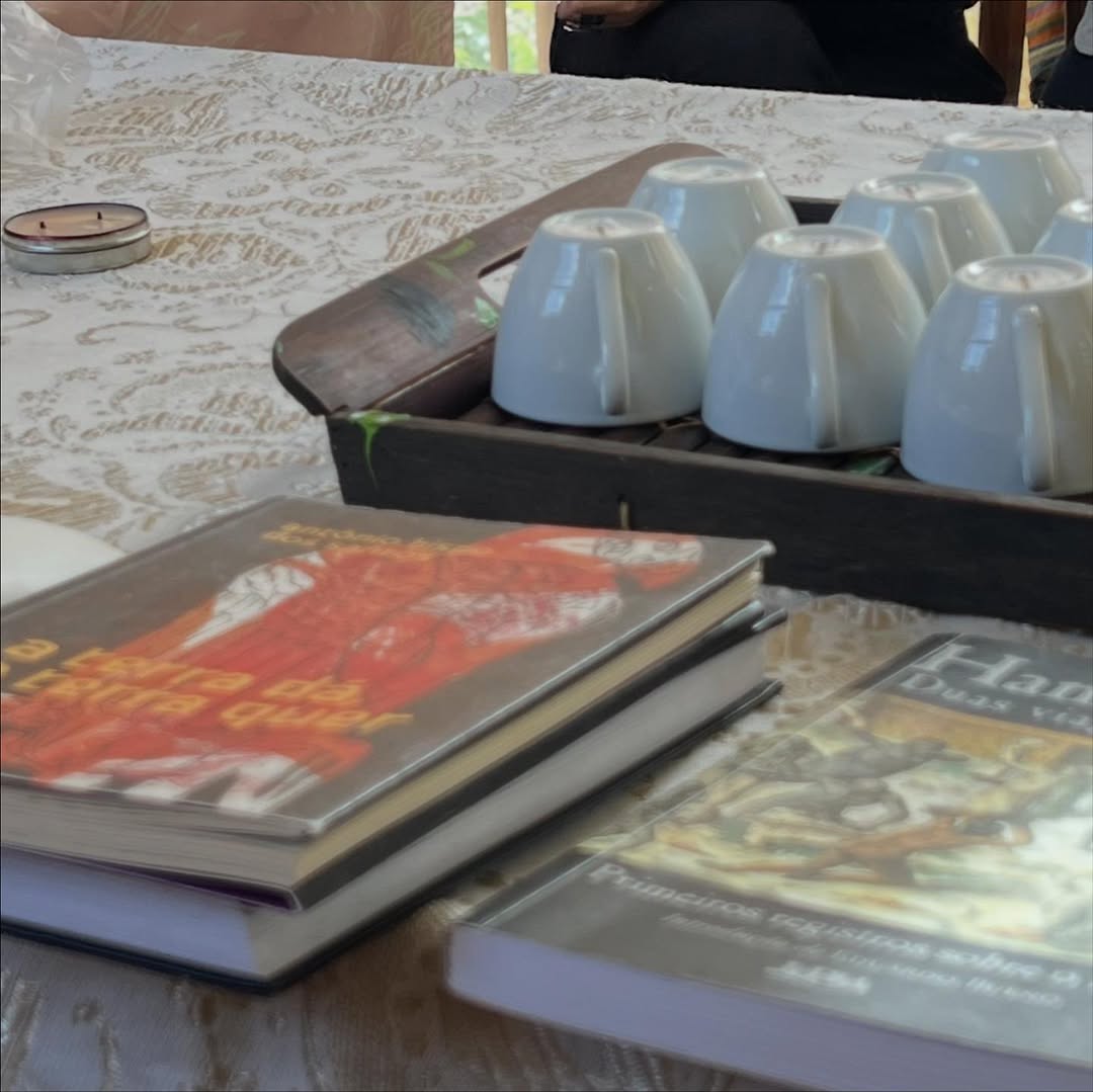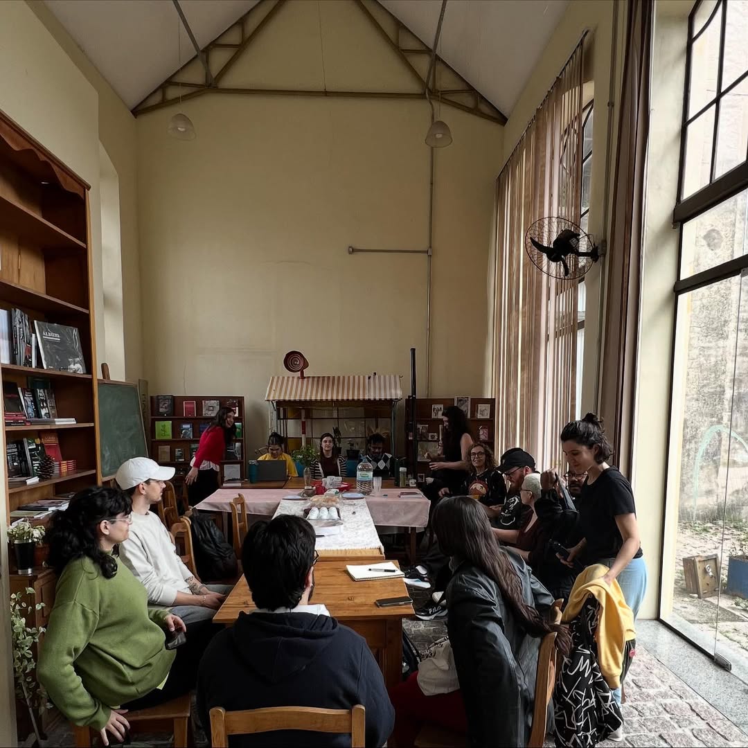 As pessoas que aceitaram o convite ao convívio foram chegando e colaborando na organização das mesas e cadeiras … os espaços em volta das mesas foram sendo ocupados e a conversa inicia com a proposição de cada participante sortear uma pergunta, num recipiente previamente organizado, e ao se sentir convidado apresentar aos demais uma narrativa livre e ao mesmo tempo articulada com os conceitos, com as obras, com as autoras e autores que vêm pesquisando.
