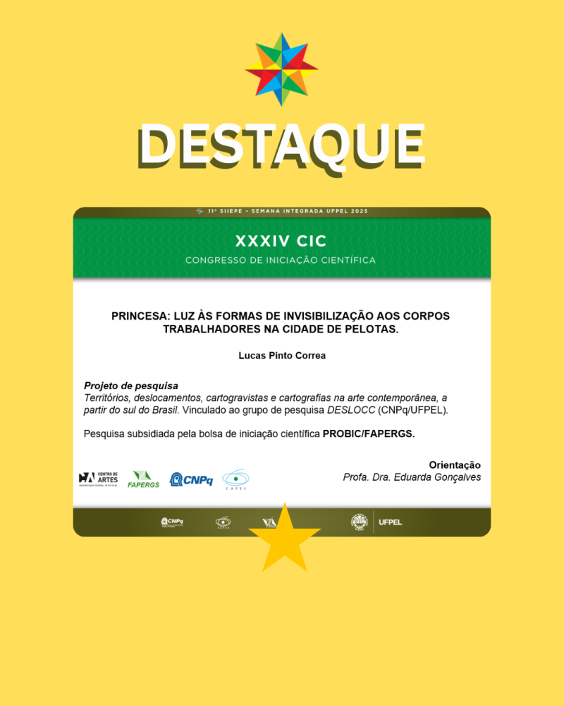 O trabalho de autoria do graduando Lucas Correa com co-autoria da Prof.Dra.Eduarda Gonçalves entitulado Princesa: Luz às Formas de Invisbilização aos Corpos Trabalhadores na Cidade de Pelotas foi o destaque de seu turno no Congresso de Iniciação Científica. Inscrito e apresentado na 11ª Semana Integrada de Inovação, Ensino, Pesquisa e Extensão da UFPel.