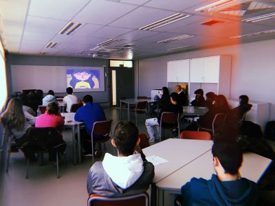 Já no dia 29 de abril, o professor Dr. Guilherme Carvalho da Rosa, dos cursos de Cinema da UFPel, acompanhado de Luísy Pacheco Corrêa, ex-estudante da escola SESI e atualmente graduanda em Cinema e Audiovisual na mesma universidade, conduziram uma oficina dedicada à linguagem cinematográfica. A atividade teve como base a exibição de uma seleção de curtas-metragens produzidos por estudantes da UFPel, escolhidos especialmente para a ocasião. A partir desses filmes, foram discutidas as implicações estéticas e culturais da linguagem audiovisual, promovendo diálogo entre a produção universitária e os estudantes do Ensino Médio, especialmente sobre as paisagens locais e a sociedade contemporânea. Para o estudante Josué Xavier, a experiência foi positiva e trouxe um novo olhar para a comunidade da zona sul do estado: “Foi uma experiência muito nova, eu nunca tinha tido algo desse tipo. Eu acho que assistir esses curtas faz com que a gente tenha uma noção tanto do que acontece no curso de cinema, quanto do que acontece nas cidades da nossa região”.