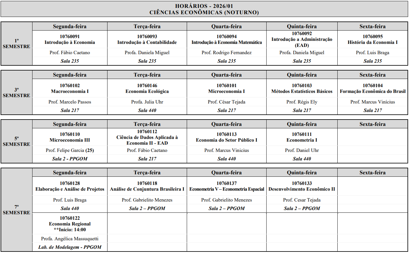 Confira a grade de horários para o período letivo 2026/01 do curso de Ciências Econômicas. Clique no link para download: Horários 2026/01 – Ciências Econômicas. […]