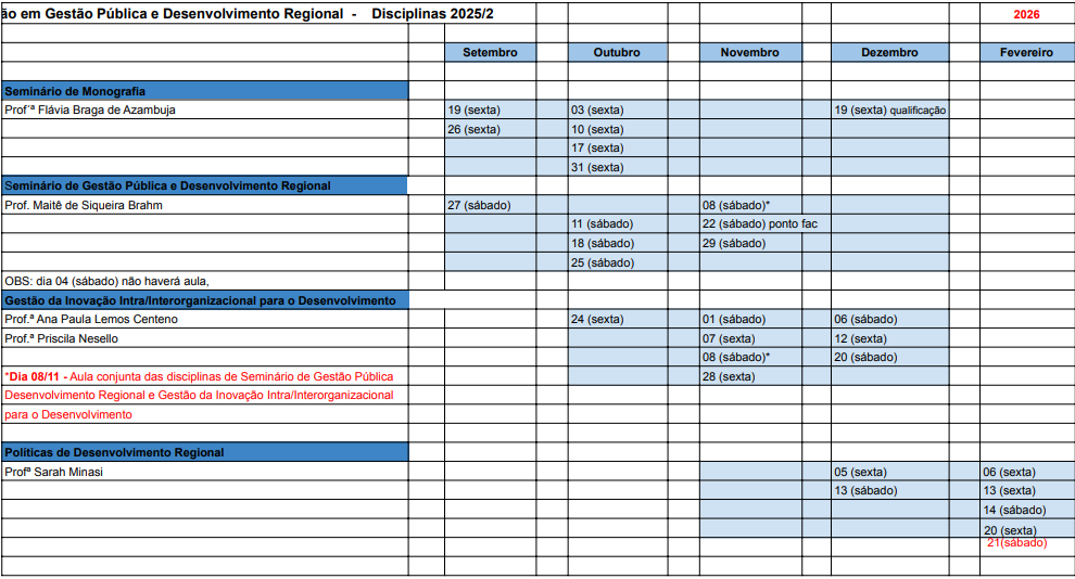 O cronograma de aulas referente ao semestre 2024/2 do curso de Especialização em Gestão Pública e Desenvolvimento Regional pode ser acessado por meio deste link: