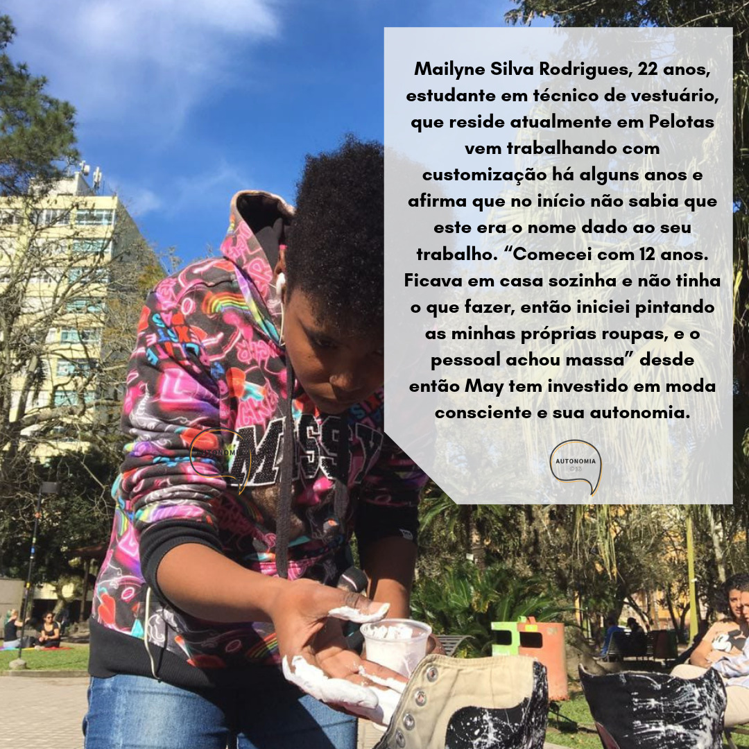 Edilaine é também uma participante do projeto atuando dentro da sua área, como autônoma. Após completar sua graduação em artes visuais, exerce a sua profissão através de artesanatos, de sua própria marca ‘Feito à Mão’. Neste caso a Autonomia 053 teve um forte papel de valorizar os produtos e os empenhos de autônomas artesãs, que causam com suas atitudes, uma reflexão sobre consumo consciente, e é exatamente isso que a terceira assessorada desta ação realiza. Mailyne formada em vestuário e graduanda em artes visuais na UFPel, criou sua marca de moda sustentável, ‘May Costumiza’. O meio de trabalho é a customização, que também é conhecida como upcycling. Upcycling nada mais é do que trazer um novo conceito e propósito para peças que estariam em desuso ou que estariam sendo considerados ao descarte. Seu objetivo é dar uma nova vida à peça, transformá-la em uma obra, dando continuidade ao ciclo de vida do produto.