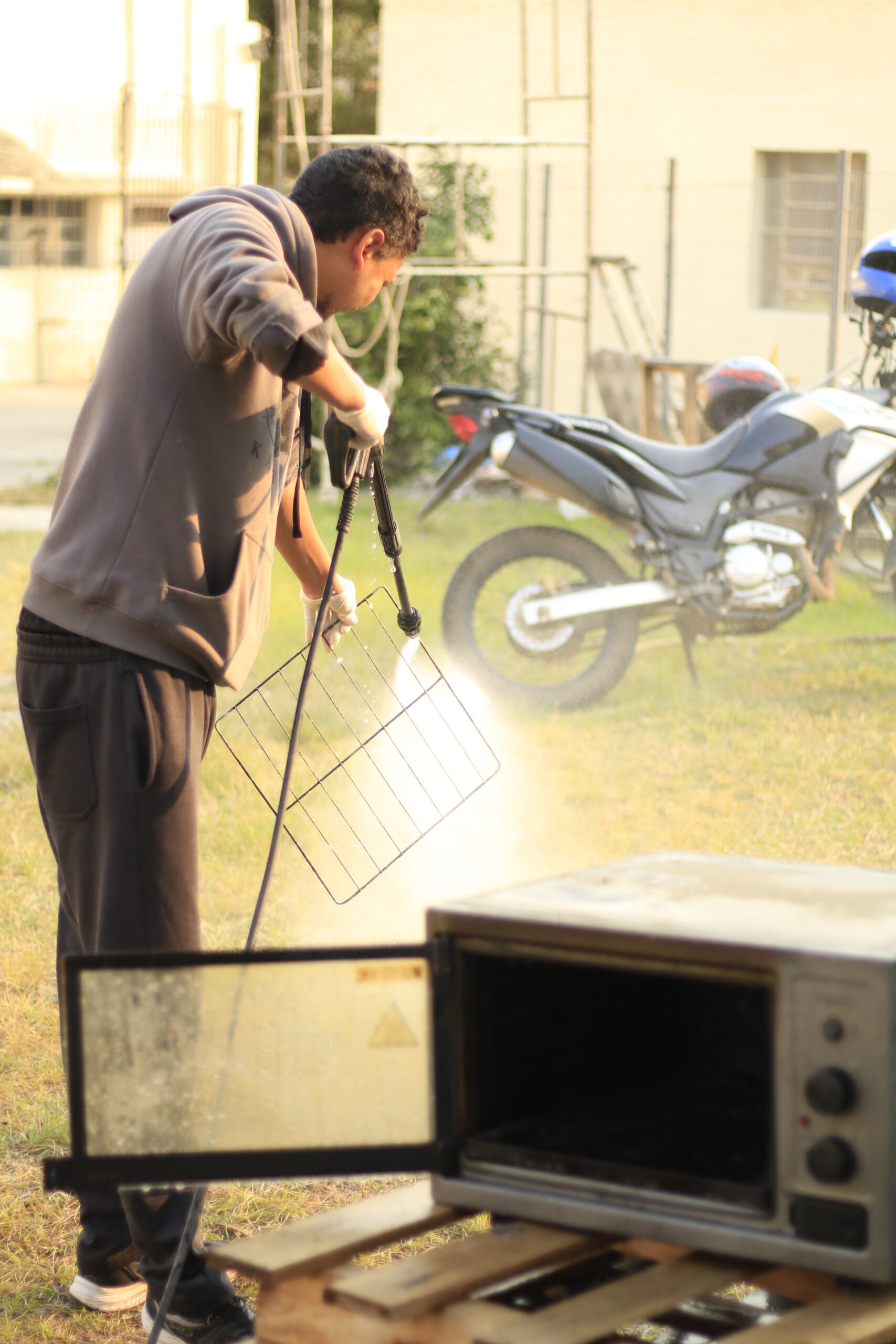 Voluntário realiza limpeza de forno elétrico. / Foto: Lara Nasi