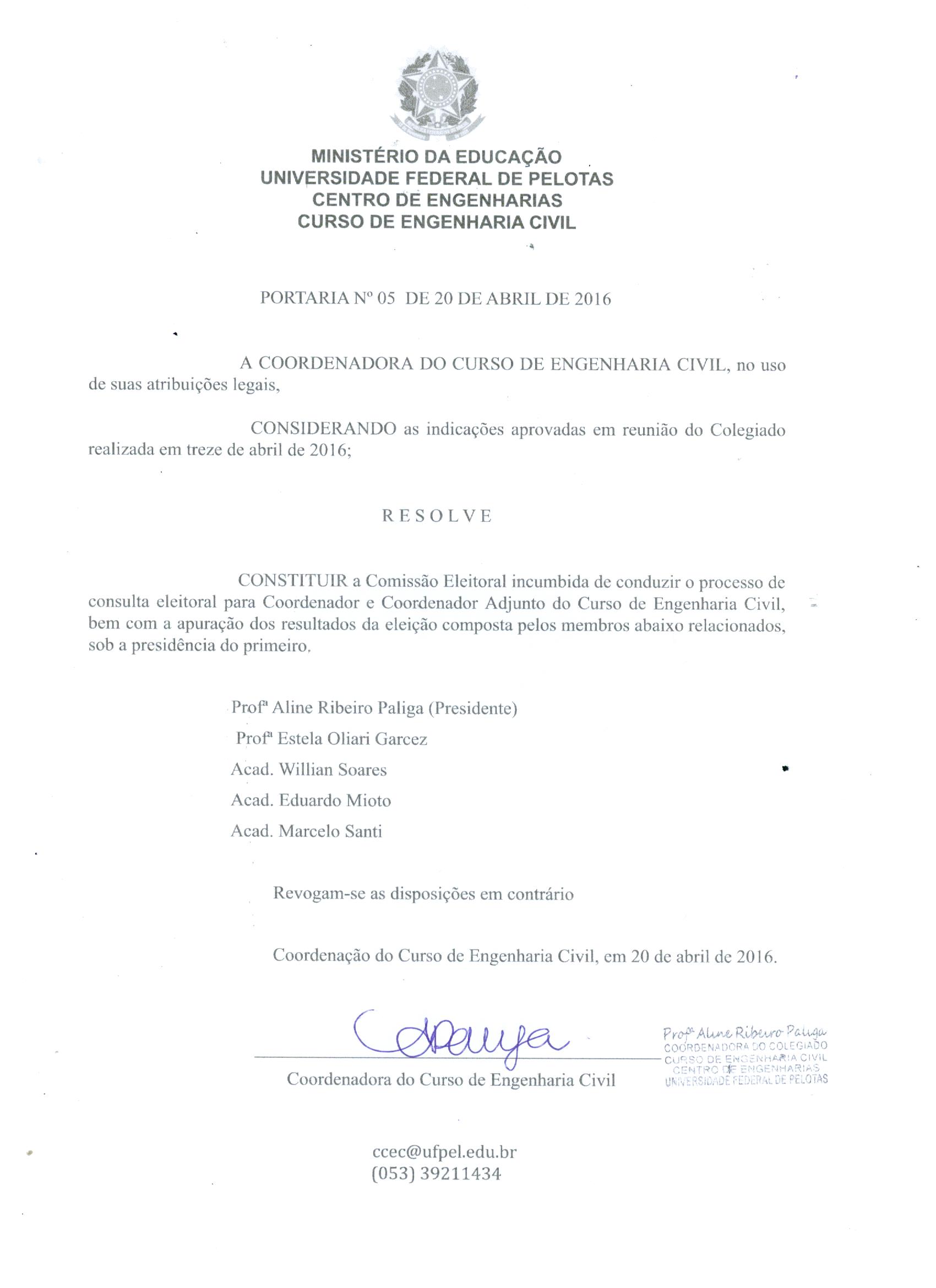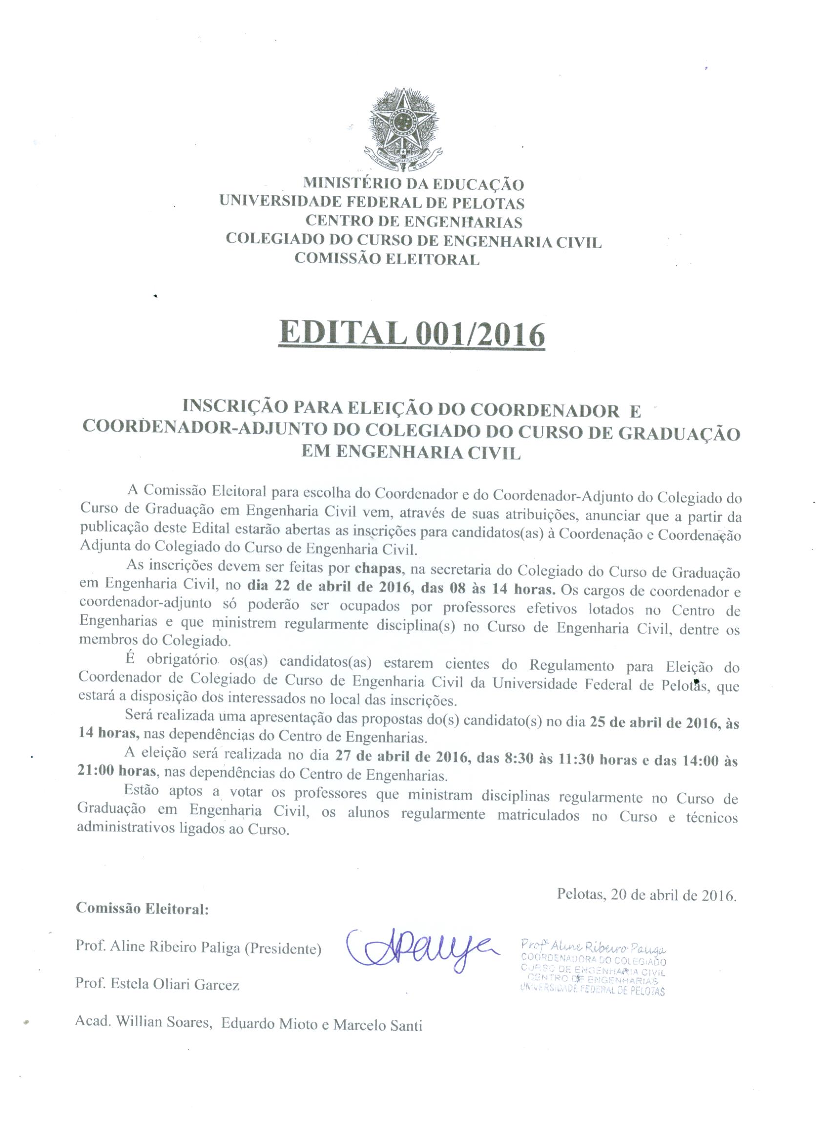 A Comissão Eleitoral para escolha do Coordenador e do Coordenador-Adjunto do Colegiado do Curso de Graduação em Engenharia Civil vem, através de suas atribuições, anunciar que a partir da publicação deste Edital estarão abertas as inscrições para candidatos(as) à Coordenação e Coordenação Adjunta do Colegiado do Curso de Engenharia Civil.