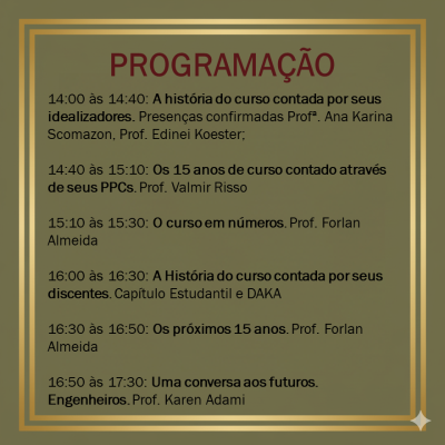 Prezada comunidade, Divulgamos a programação de nosso evento de comemoração dos 15 anos do Curso. 14:00 às 14:40: A história do curso contada por seus idealizadores. Presenças confirmadas: Profª. Ana Karina Scomazon, Prof. Edinei Koester; 14:40 às 15:10: Os 15 anos de curso contado através de seus PPCs. Prof. Valmir Risso 15:10 às 15:30: O curso em números. Prof. Forlan Almeida 16:00 às 16:30: A História do curso contada por seus discentes. Capítulo Estudantil e DAKA 16:30 às 16:50: Os próximos 15 anos. Prof. Forlan […]