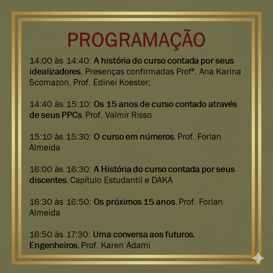 14:00 às 14:40: A história do curso contada por seus idealizadores. Presenças confirmadas: Profª. Ana Karina Scomazon, Prof. Edinei Koester;