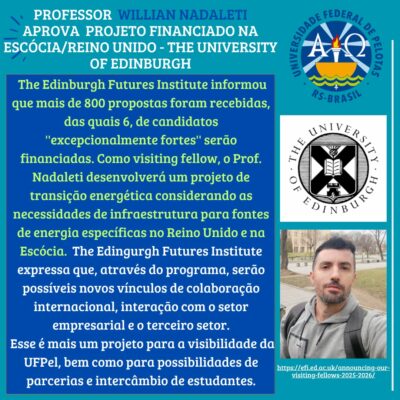The Edinburgh Futures Institute informou que mais de 800 propostas foram recebidas, das quais 6, de candidatos “excepcionalmente fortes”, serão financiadas. Como visiting fellow, o Prof. Willian Nadaleti desenvolverá um projeto de transição energética considerando as necessidades de infraestrutura para fontes de energia específicas no Reino Unido e na Escócia. The Edinburgh Futures Institute expressa que, através do programa, serão possíveis novos vínculos de colaboração internacional, interação com o setor empresarial e o terceiro setor. Esse é mais um projeto para a visibilidade da UFPel, bem como para possibilidades de parcerias e intercâmbio de estudantes.