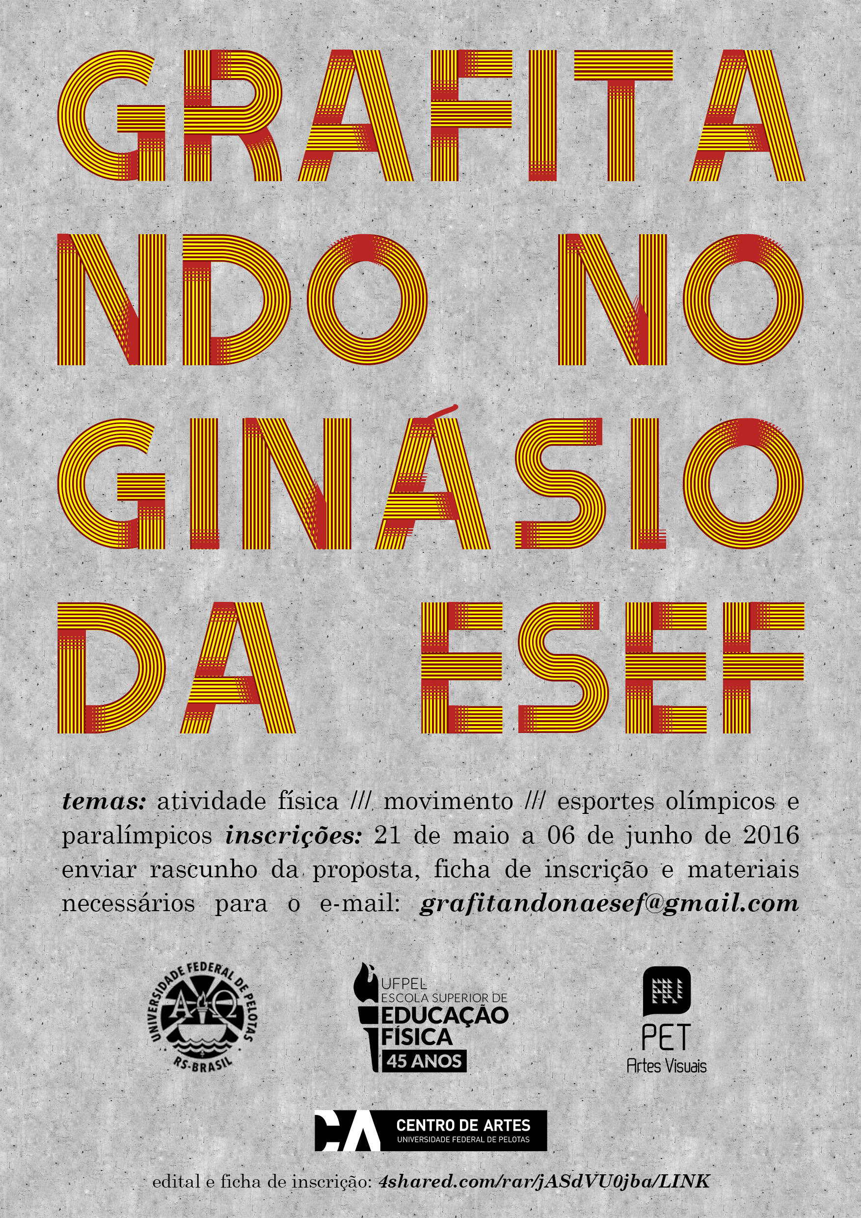 O Projeto Grafitando no Ginásio da ESEF da Universidade Federal de Pelotas torna público que estão abertas inscrições a seleção de alunos para apresentarem proposta de painéis em grafite para as paredes do ginásio da ESEF/UFPel.