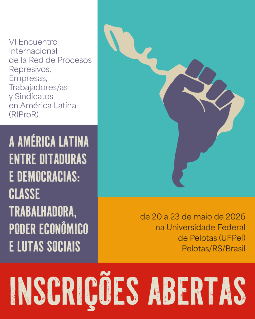As inscrições para o VI Encuentro Internacional de la Red de Procesos Represivos, Empresas, Trabajadores/as y Sindicatos en América Latina (RIProR) são gratuitas e podem ser realizadas nas modalidades de OUVINTE e APRESENTADORES/AS DE TRABALHO em Simpósio Temático.