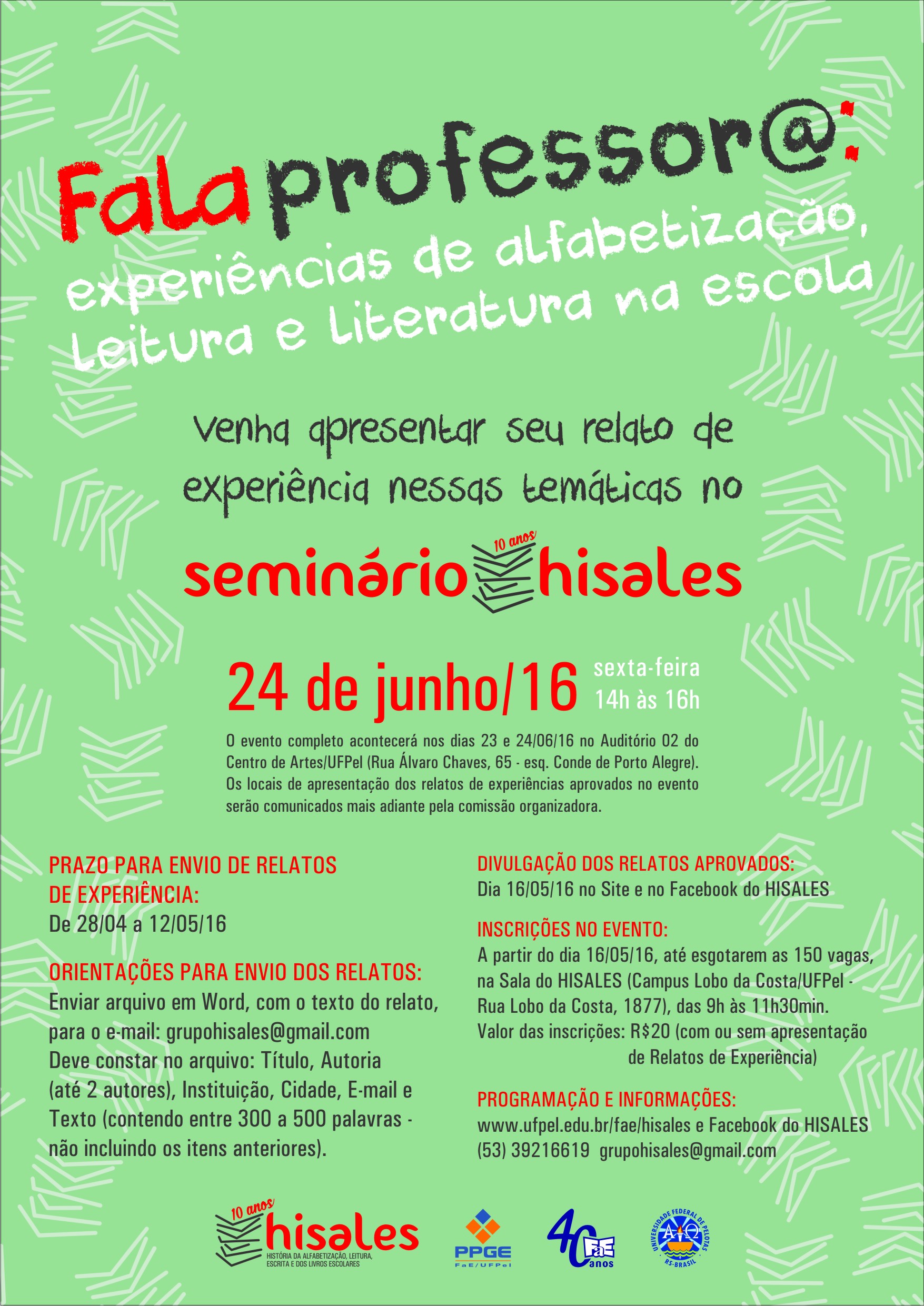 O Grupo de Pesquisa “História da Alfabetização, Leitura, Escrita e dos Livros Escolares – HISALES”, vinculado à FaE/PPGE/UFPel, convida vocês para o