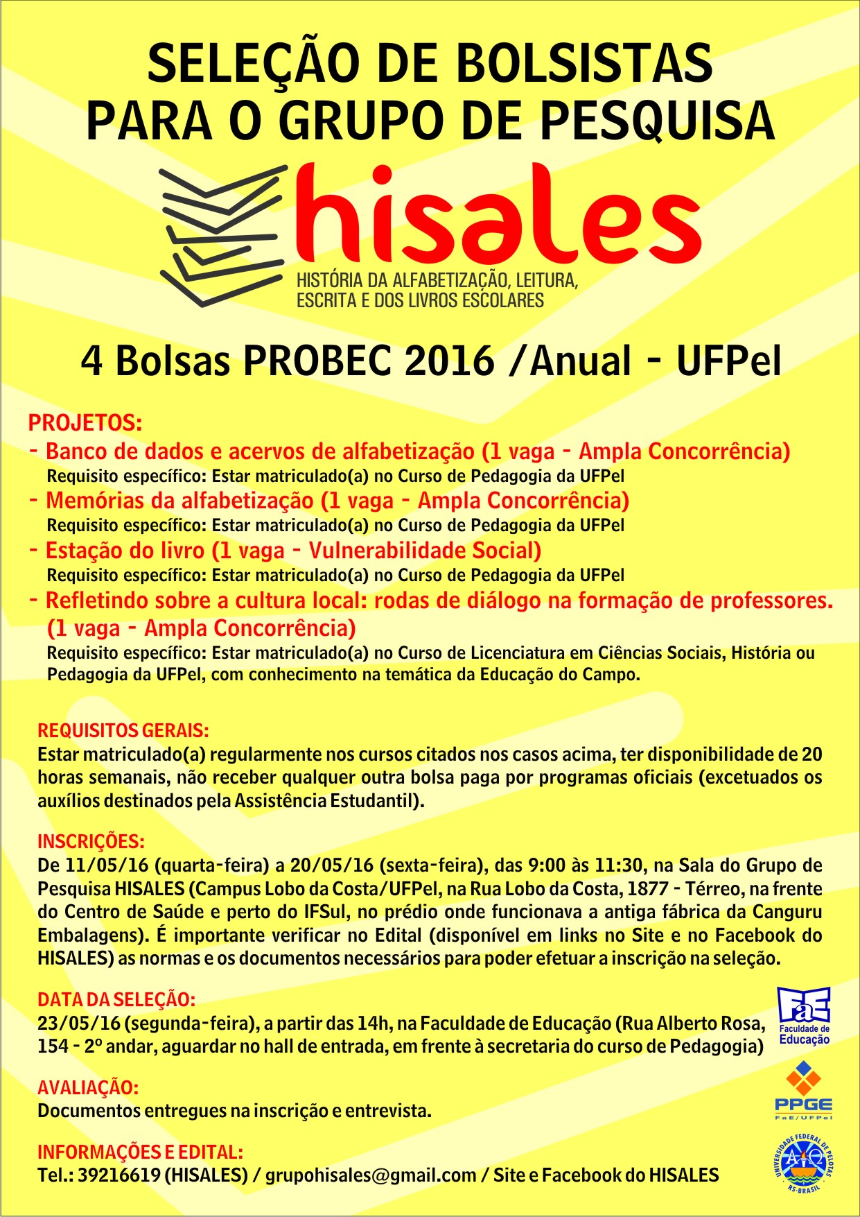 O HISALES está selecionando Bolsistas PROBEC – UFPel. Inscrições de 11 a 20 de maio (na sala do HISALES). Vejam informações no cartaz abaixo e no edital disponível no link: https://drive.google.com/file/d/0Bw5ZU4xPa5UQbXhBMDVmTTZUUVE/view