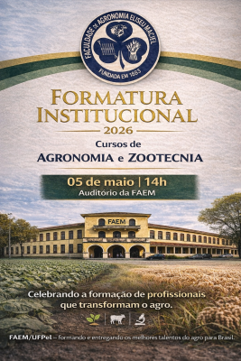 A Faculdade de Agronomia Eliseu Maciel da Universidade Federal de Pelotas (FAEM/UFPel) informa à comunidade acadêmica as datas e horários das cerimônias de Formaturas Institucionais, que ocorrerão nos dias 05, 06, 07 e 08 de maio, no Auditório da FAEM.