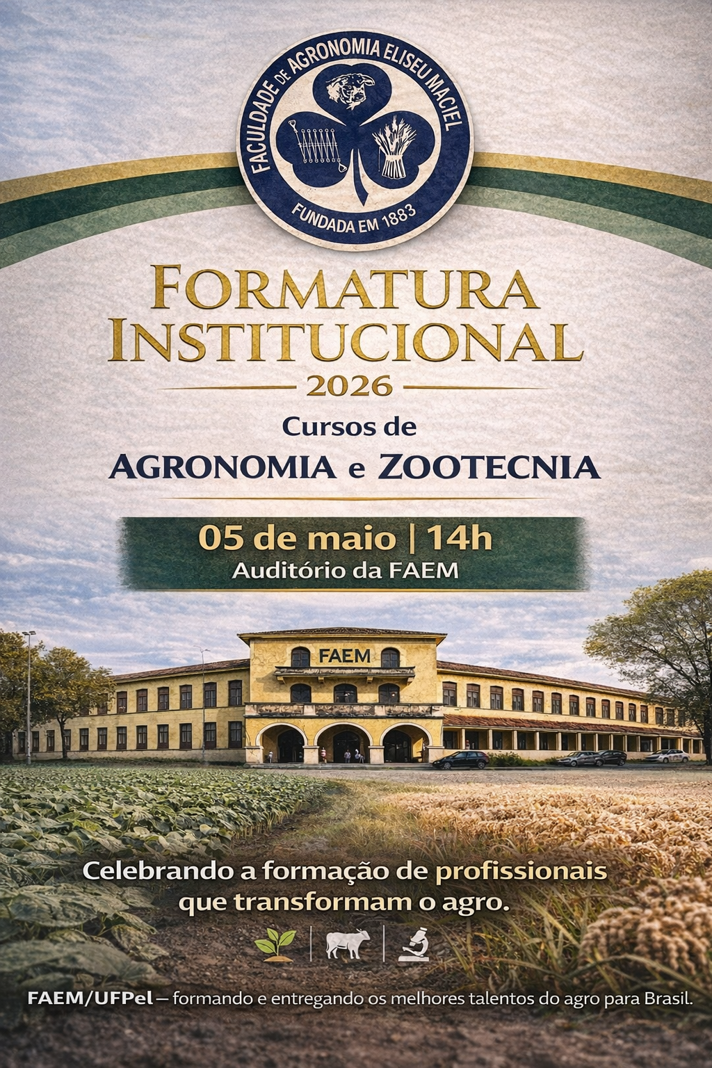 A Faculdade de Agronomia Eliseu Maciel (FAEM/UFPel) convida toda a comunidade acadêmica — estudantes, docentes, técnicos e parceiros — para a Aula Inaugural do semestre letivo 2026/1.