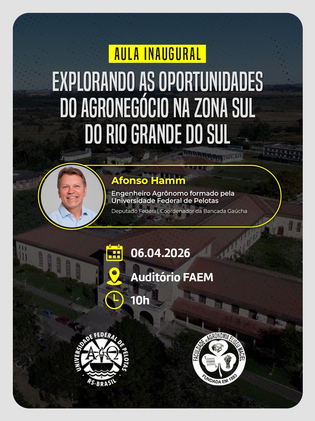 A aula contará com a presença do ex-aluno da FAEM/UFPel, Engenheiro Agrônomo e Deputado Federal Afonso Hamm, que compartilhará sua trajetória e visão sobre o desenvolvimento do setor, evidenciando como a universidade forma profissionais capazes de gerar impacto no Brasil.