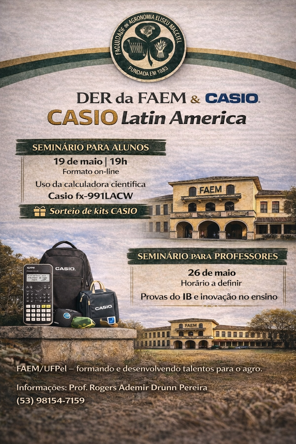 O Departamento de Engenharia Rural (DER) da Faculdade de Agronomia Eliseu Maciel (FAEM/UFPel), no âmbito do acordo de cooperação nº 003/2024 (Proc. 23110.027849/2023-83), coordenador pelo Prof. Rogers Ademir Drunn Pereira convida a comunidade acadêmica a participar de uma série de atividades em parceria com a CASIO Latin America, com foco no uso educacional de calculadoras científicas e no aprimoramento das práticas de ensino.