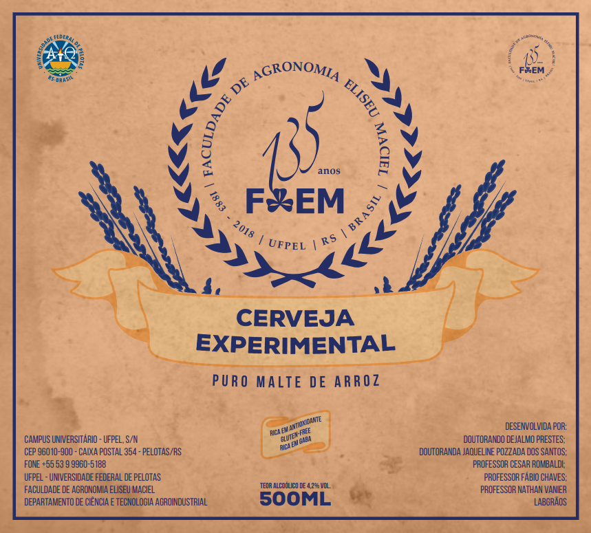 Do objeto tese do Engenheiro Agrônomo Dejalmo Nolasco Prestes, servidor da FAEM-UFPel (doutorando do PPGCTA), foi desenvolvida uma estratégia para a produção dessa cerveja, 100% malte de arroz, que, além de ser um produto glúten free, é rica em ácido gama-aminobutírico (GABA) e em compostos fenólicos. Na concepção da idéia e na conduçãos dos trabalhos participaram os docentes Manoel Schirmer (FAEM-DCTA-Aposentado), Nathan Vanier e Cesar Rombaldi (FAEM-DCTA), o Engenheiro Químico Adreando Spessato (mestrando no Curso de Mestrado Profissional em CTA) e o acadêmico André Talhamento (formado em março de 2018).