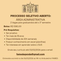 A Faculdade de Medicina da UFPel informa que está com Processo Seletivo aberto na área Administrativa. Poderão concorrer ás vagas, graduandos que estejam cursando até o 3º semestre do curso. Bolsa: R$ 1080,00 Pré-requisitos: Ser proativo; Ter mais de 18 anos; Disponibilidade de 20 horas semanais; Possuir conhecimento em excel (planilhas); Ter interesse em aprender sobre o SUS Para se inscrever, o candidato deverá enviar seu currículo para o e-mail famedagenda@gmail.com até o dia 03/02/2026. A entrevista ocorrerá no dia 06/02/2026, às 14h, no Ambulatório […]