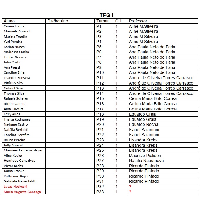 Vocês devem enviar ao Colegiado, por e-mail (colegiadofaurb@gmail.com), os dias e horários (e o nome do respectivo orientador, para quem não enviou) das suas orientações, até 12 de dezembro, quinta-feira!!!