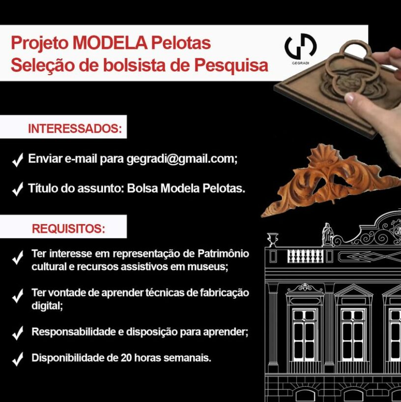 O GEGRADI está realizando um seleção de bolsistas de pesquisa para atuarem no Projeto Modela Pelotas. Confiram os detalhes no cartaz abaixo: