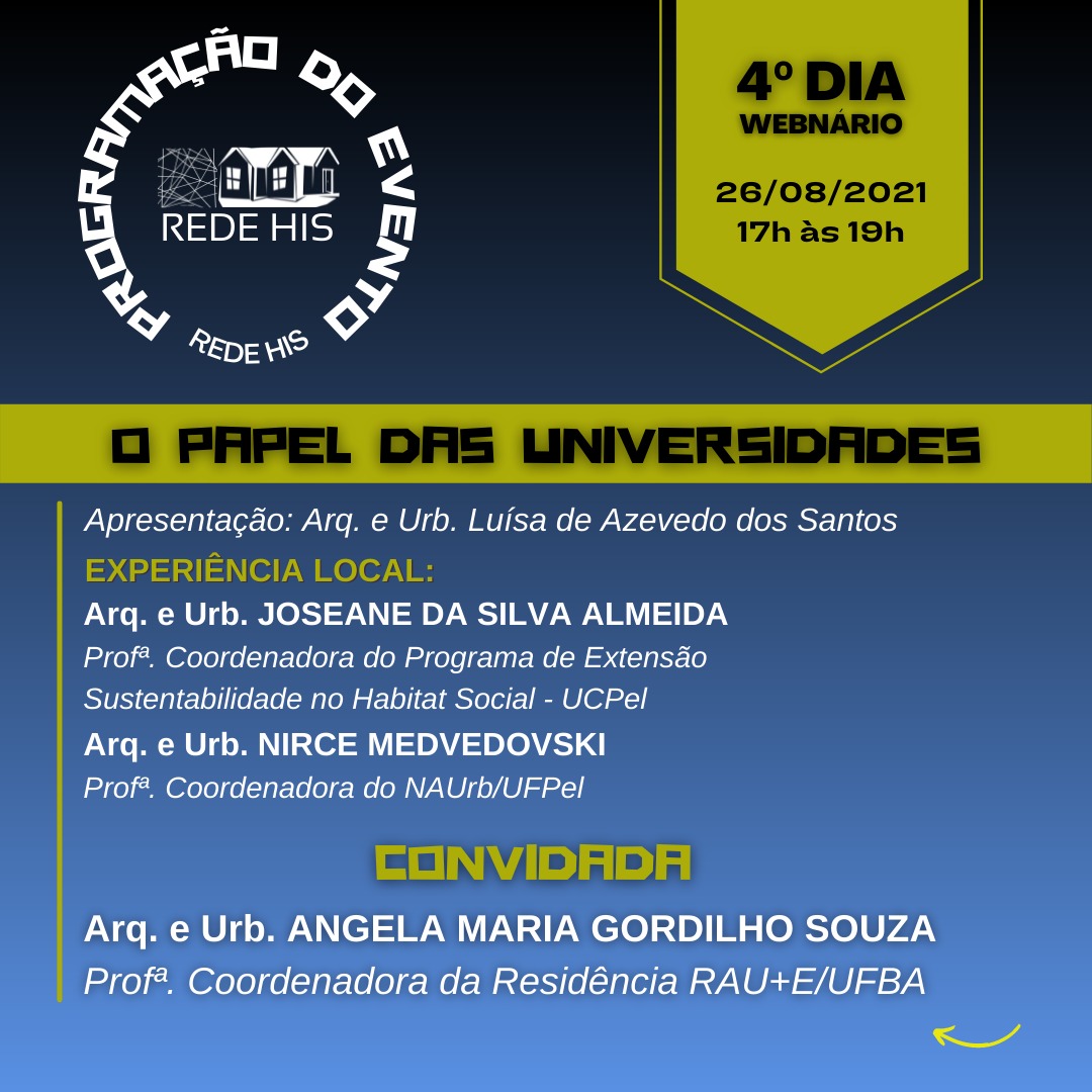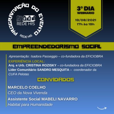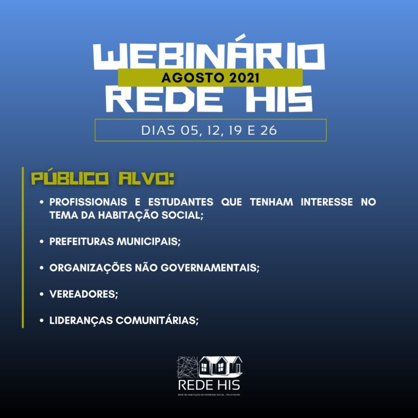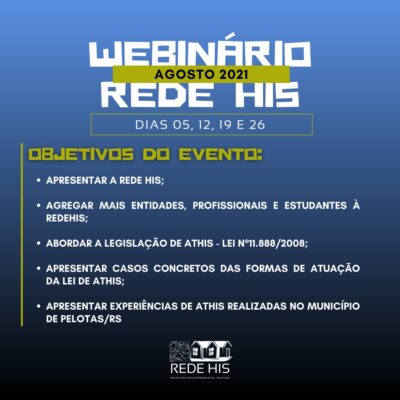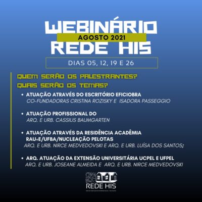 A REDE HIS está promovendo um webnar com diversos convidados incríveis pra falar sobre habitação e Assessoria técnica na prática! Curtam a página da REDE para mais informações: https://www.facebook.com/redehispelotas/