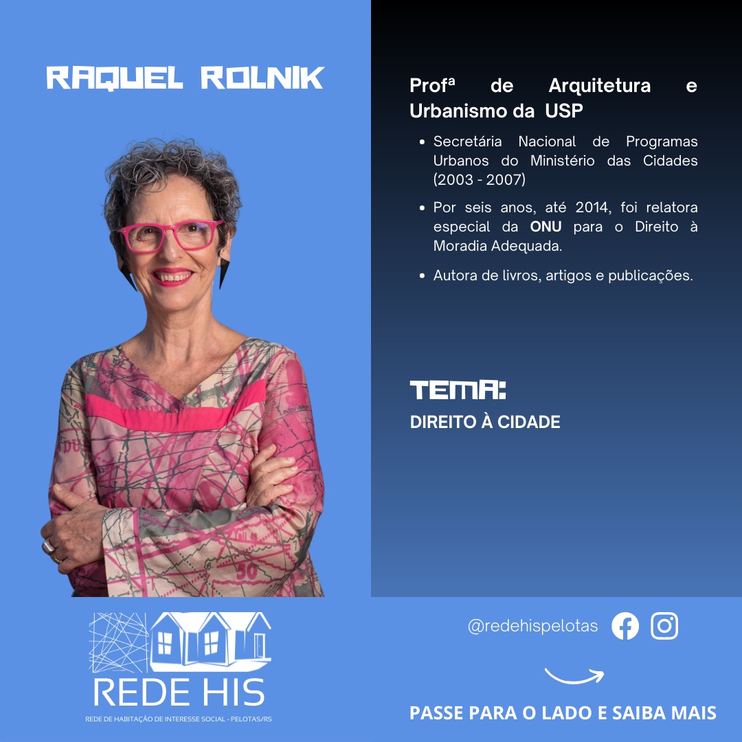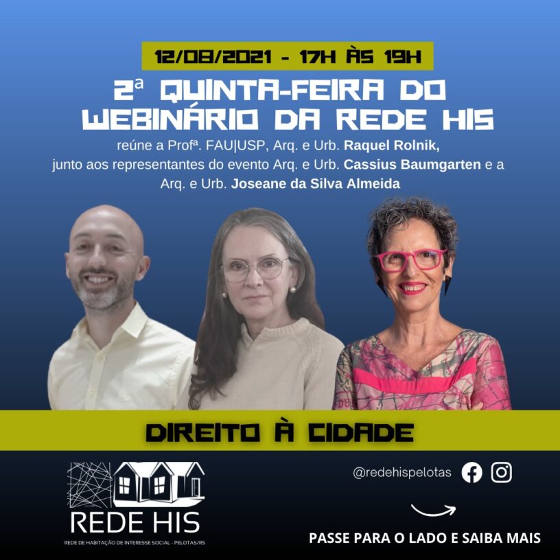 • Nessa Quinta feira o WEBNARIO da REDE ATHIS vai receber os Arquitetos Cassius Baumgarten e Joseane Almeida, e a convidada especial profª titular da Faculdade de Arquitetura e Urbanismo da USP – Universidade de São Paulo, Raquel Rolnik.