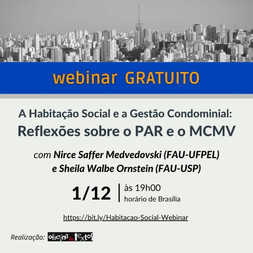 A editora Oficina de Textos irá promover dois webinars com autores do livro “Qualidade Ambiental na Habitação: avaliação pós-ocupação”. O primeiro será o webinar “A Habitação Social e a gestão Condominial: reflexões sobre o PAR e o MCMV e a arte para divulgação” com as palestrantes: Nirce Saffer Medvedovski e Sheila Walbe Ornstein. Quando: 1º de dezembro – quarta-feira – 19h INSCRIÇÃO: https://bit.ly/Habitacao-Social-Webinar