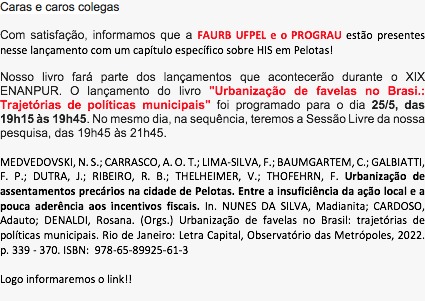 Notícias Lançamento do Livro: Urbanização de favelas no Brasil – trajetórias de políticas municipais Publicado por rogerbraga em 25/05/2022 Leia também → Notícias 12º Seminário Internacional Projetar Notícias Podcast Café com Extensão Notícias Professora Lisandra Krebs recebe reconhecimento em comemoração ao dia internacional de mulheres e meninas na ciência Compartilhe: Clique para compartilhar no Facebook(abre em nova janela) Facebook Clique para compartilhar no WhatsApp(abre em nova janela) WhatsApp Relacionado Comments comments rogerbraga Leia também → Notícias 12º Seminário Internacional Projetar Notícias Podcast Café com Extensão Notícias Professora Lisandra Krebs recebe reconhecimento em comemoração ao dia internacional de mulheres e meninas na ciência