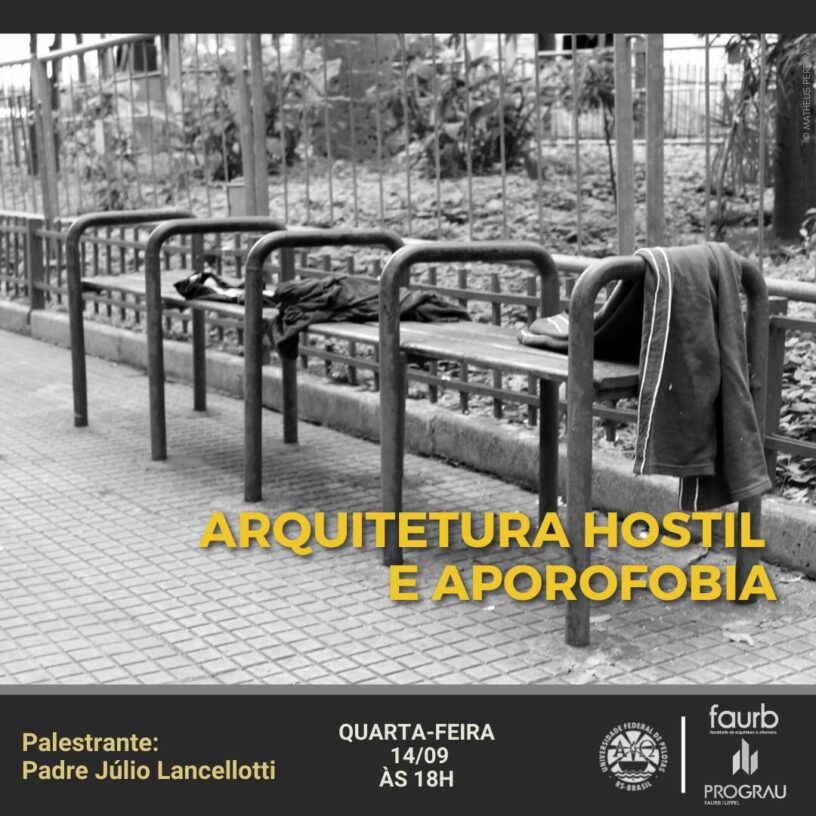 O Laboratório de Estudos Comportamentais da Faculdade de Arquitetura e Urbanismo da Universidade Federal de Pelotas convida a todos para a palestra com nosso convidado @padrejulio.lancellotti. Estaremos conversando sobre aporofobia e arquitetura hostil, temas extremamente importantes para a construção de uma cidade para todos. Aporofobia e arquitetura hostil devem ser combatidas por todos. Nosso encontro será presencial e a presença do nosso convidado será via plataforma digital. Não haverá acesso a convidados de forma online, quem quiser estar na nossa conversa venha dia 14 de setembro as 18:00 horas para a Faculdade de Arquitetura e Urbanismo da @ufpeloficial Cheguem cedo para garantir seus lugares, teremos dois telões, café e pipoca para todos . Todos são bem vindos.
