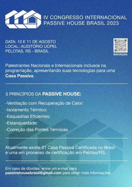 Nos dias 10 e 11 de agosto de 2023, na cidade de Pelotas/RS, no auditório da UCPel, ocorrerá o IV Congresso Internacional Passive House Brasil. O evento contará com a participação de palestrantes nacionais e internacionais inclusos na sua programação, apresentando suas tecnologias para sua Casa Passiva.