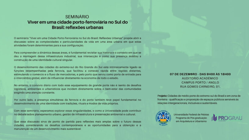 O objetivo do evento é discutir sobre as complexidades da vida em uma área urbana onde as características ferroviárias e portuárias foram determinantes para a sua configuração e a consequente construção de uma identidade cultural singular. O Seminário integra as ações do projeto de pesquisa da UFPel: “Cidades de médio porte do extremo sul do Brasil e em zona de fronteira – qualificação e proposição de espaços públicos sensíveis às relações intergeracionais, inclusivas e sustentáveis”.