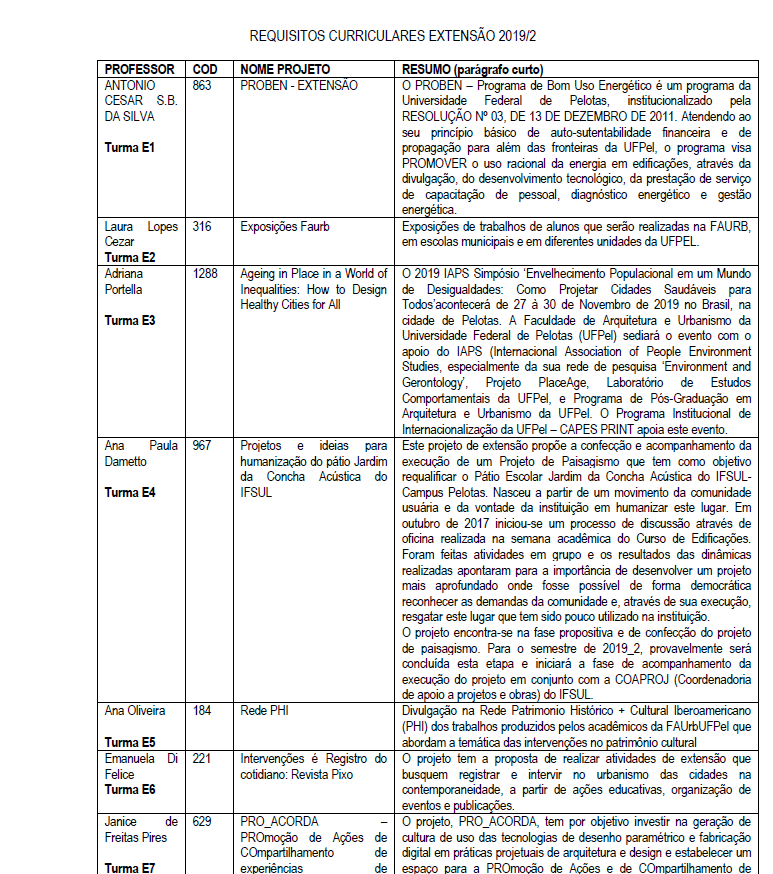 Detalhes sobre as turmas ofertadas de Requisitos Curriculares de Extensão 2019/02