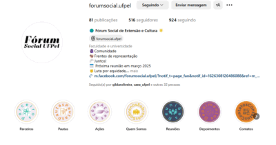 O Fórum Social da UFPel também vive nas redes! No nosso Instagram, compartilhamos os bastidores das ações, registros das reuniões, depoimentos, conteúdos educativos e convites para participar conosco da construção de uma universidade mais aberta, humana e conectada com a sociedade.
