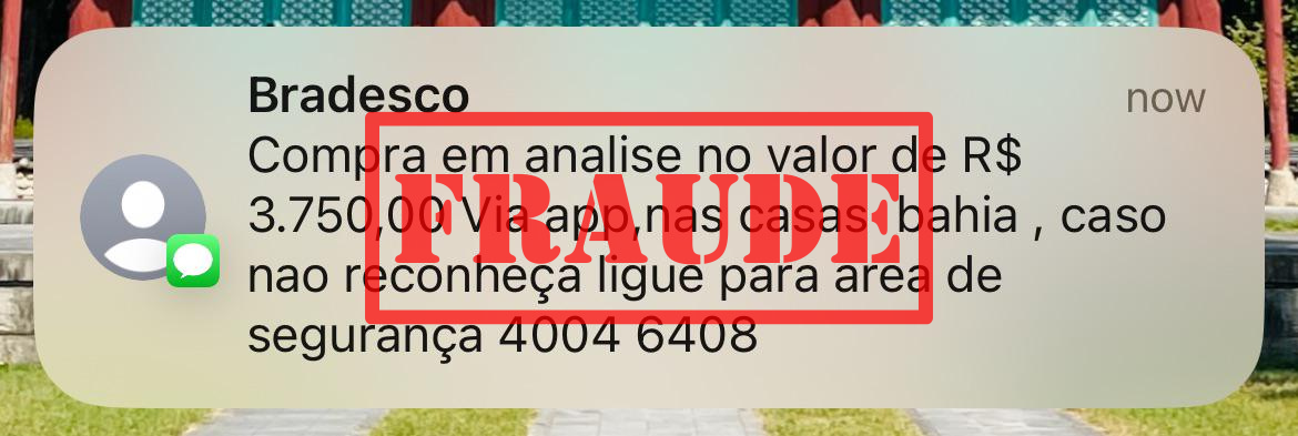Descrição: A vítima recebe um SMS alertando de uma suposta compra com um valor exacerbado em uma loja online. Ao final da mensagem, há o contato de uma central falsa da referida loja.
