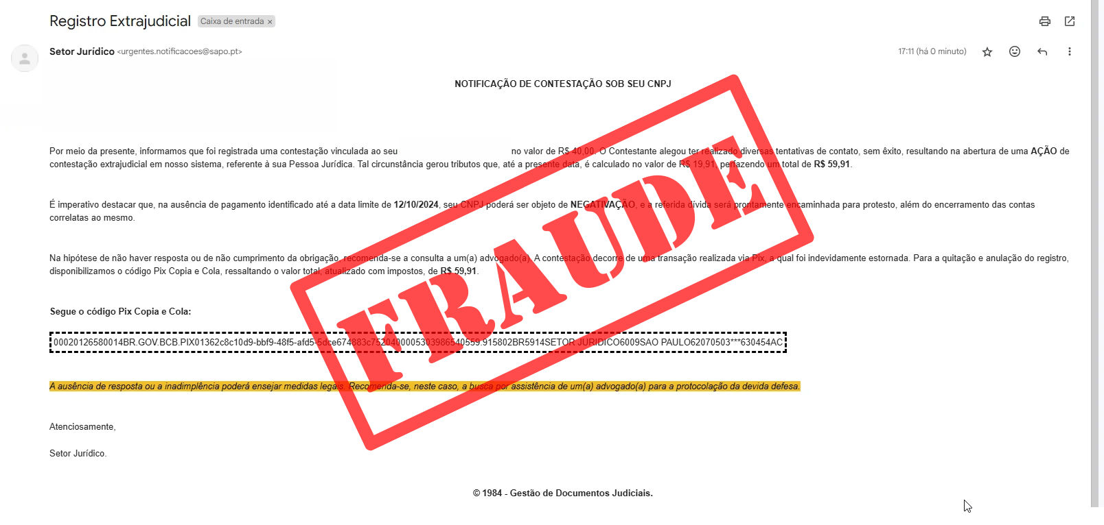 Descrição: A vítima recebe um e-mail informando a respeito de uma vinculação vinculada a um CNPJ seu. Ao final da mensagem, há uma chave PIX aleatória para que a vítima faça a transferência do valor requisitado.