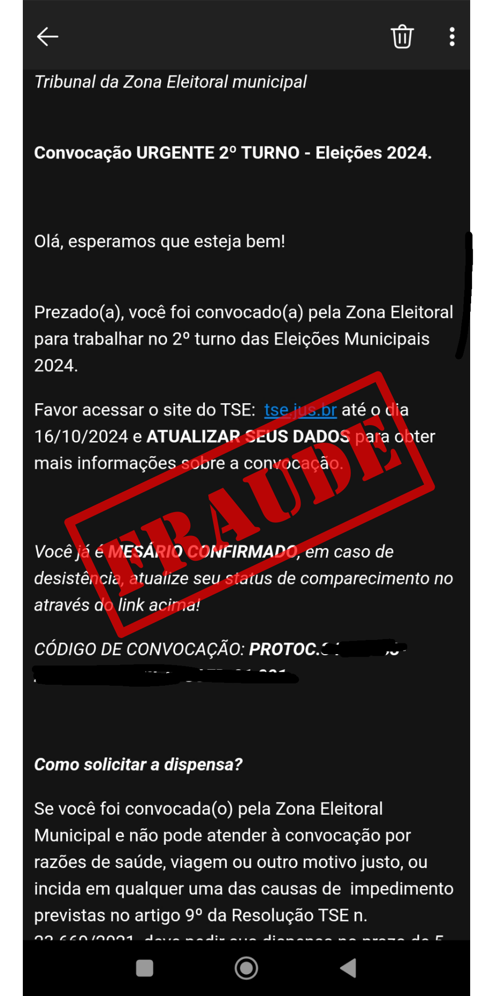 Descrição: A vítima recebe um e-mail informando que foi convocada para atuar como mesário voluntário no 2º turno das eleições municipais 2024. No corpo da mensagem, há um link (supostamente tse.jus.br), entretanto, está direcionando para uma página falsa.