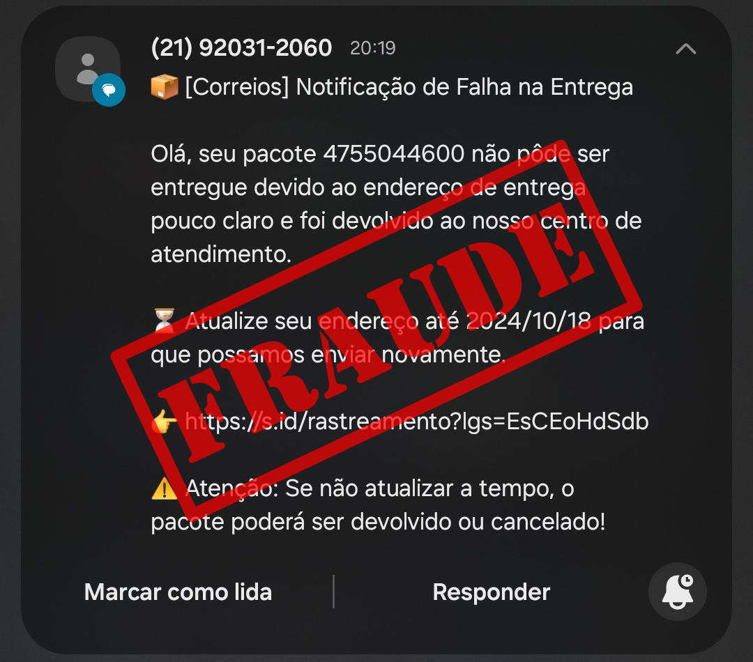 Descrição: A vítima recebe um SMS alertando de uma falha na entrega de uma encomenda pelos Correios. A mensagem contém um link para que a vítima possa “atualizar seu endereço”, entretanto, trata-se de um link malicioso.