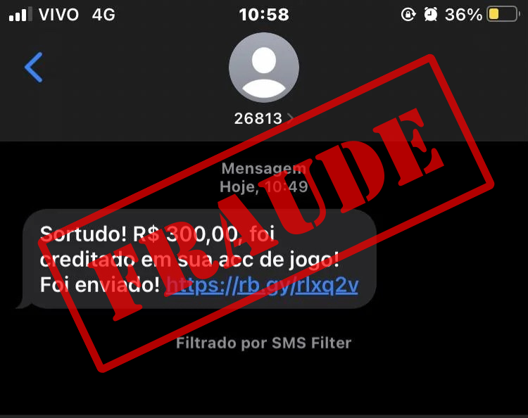 Descrição: A vítima recebe uma SMS alegando que recebeu um valor de depósito decorrente de um jogo de azar. Logo abaixo da mensagem há um link (supostamente para verificar o comprovante do pagamento), no entanto, trata-se de um link malicioso.