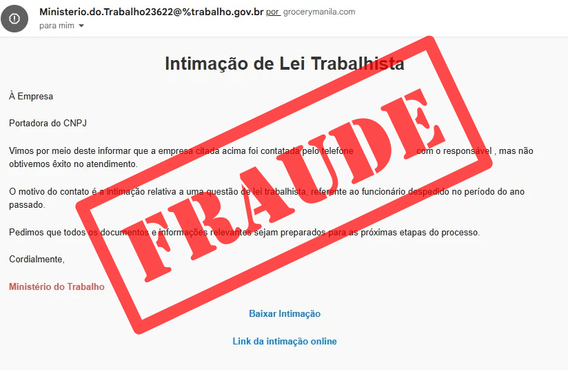 Descrição: A vítima recebe um e-mail de uma intimação referente a um descuumprimento de lei trabalhista em determinada empresa. Ao final da mensagem, há dois links maliciosos de “verificação da intimação”.