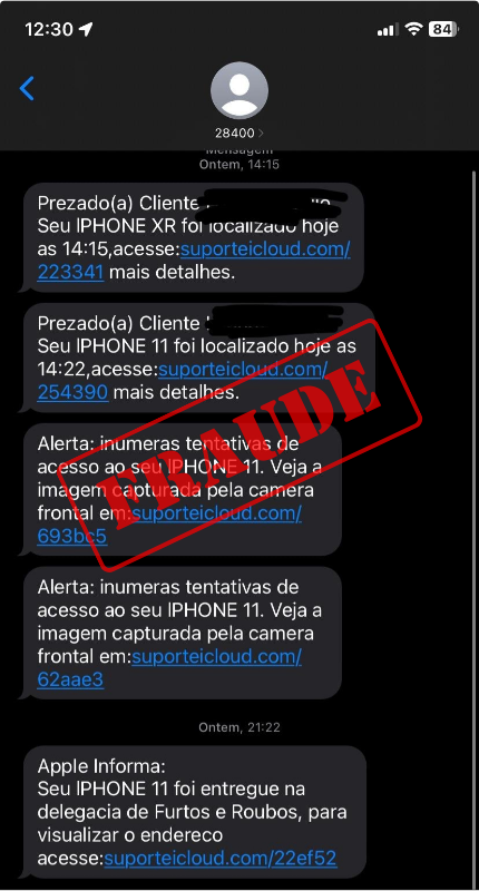Descrição: A vítima recebe uma sequência de SMS’s contendo um link (supostamente direcionando para o icloud, a fim de obter a geolocalização do dispositivo), no entanto, trata-se de um link malicioso.