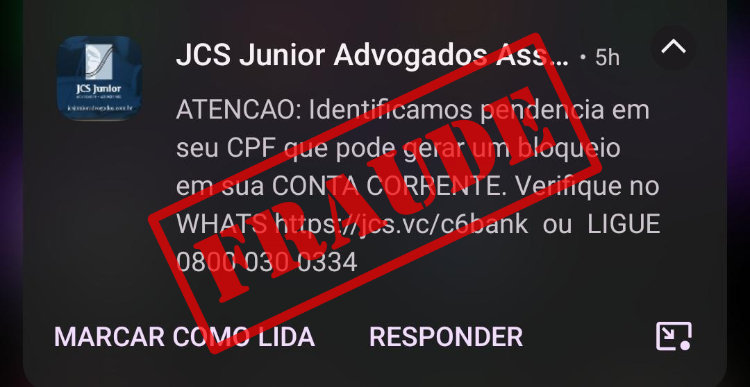 Descrição: A vítima recebe uma mensagem via WhatsApp alegando que há uma pendência em seu CPF que pode resultar no bloqueio de sua conta corrente. A mensagem conta com um link e um número de telefone para “verificar” a situação, no entanto, trata-se de um golpe.