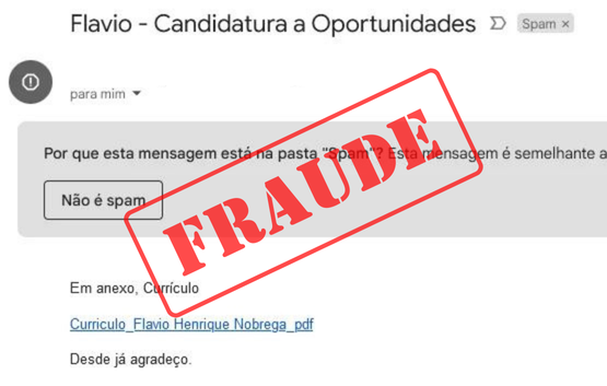Descrição: A vítima recebe um e-mail, aparentemente de um candidato a uma vaga de emprego. Em anexo, há um arquivo em formato PDF (supostamente o currículo), no entanto, trata-se de um arquivo malicioso.