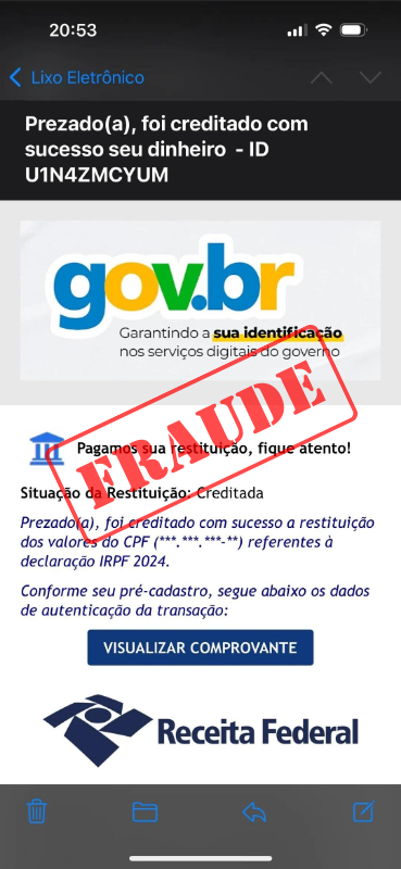 Descrição: A vítima recebe um e-mail contendo um link para a visualização de um suposto comprovante de restituição do IRPF 2024, no entanto, trata-se de um link malicioso.