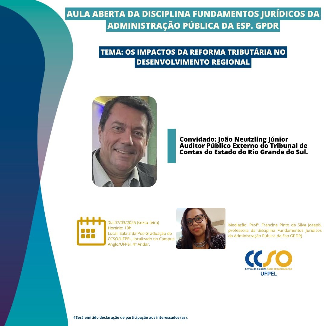 A Especialização em Gestão Pública e Desenvolvimento Regional da UFPel convida a comunidade universitária para a aula aberta “Os impactos da reforma tributária no desenvolvimento regional”, com o Auditor Público João Neutzling Junior. O evento acontece nesta sexta, dia 07 de fevereiro, às 19 horas, na Sala 2 (Pós-Graduação) do Campus Anglo.