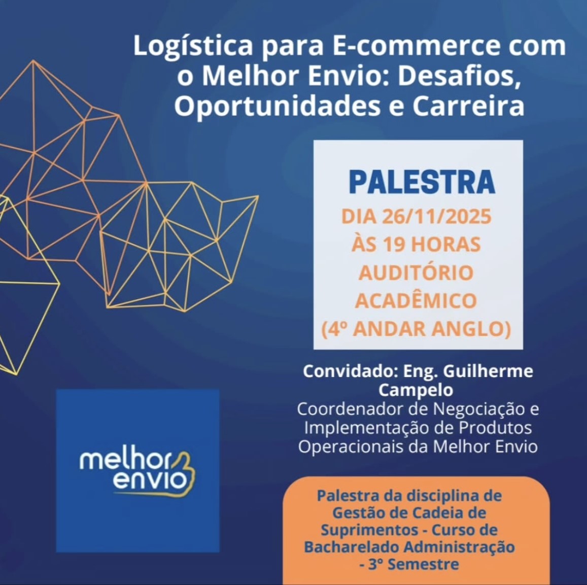 O Centro de Ciências Sócio-Organizacionais (CCSO) da Universidade Federal de Pelotas promove, no dia 26 de novembro de 2025, a palestra “Logística para E-commerce com o Melhor Envio: desafios, oportunidades e carreira”. A atividade será ministrada pelo Engenheiro Guilherme Campelo, Coordenador de Negociação e Implementação de Produtos Operacionais da empresa Melhor Envio.